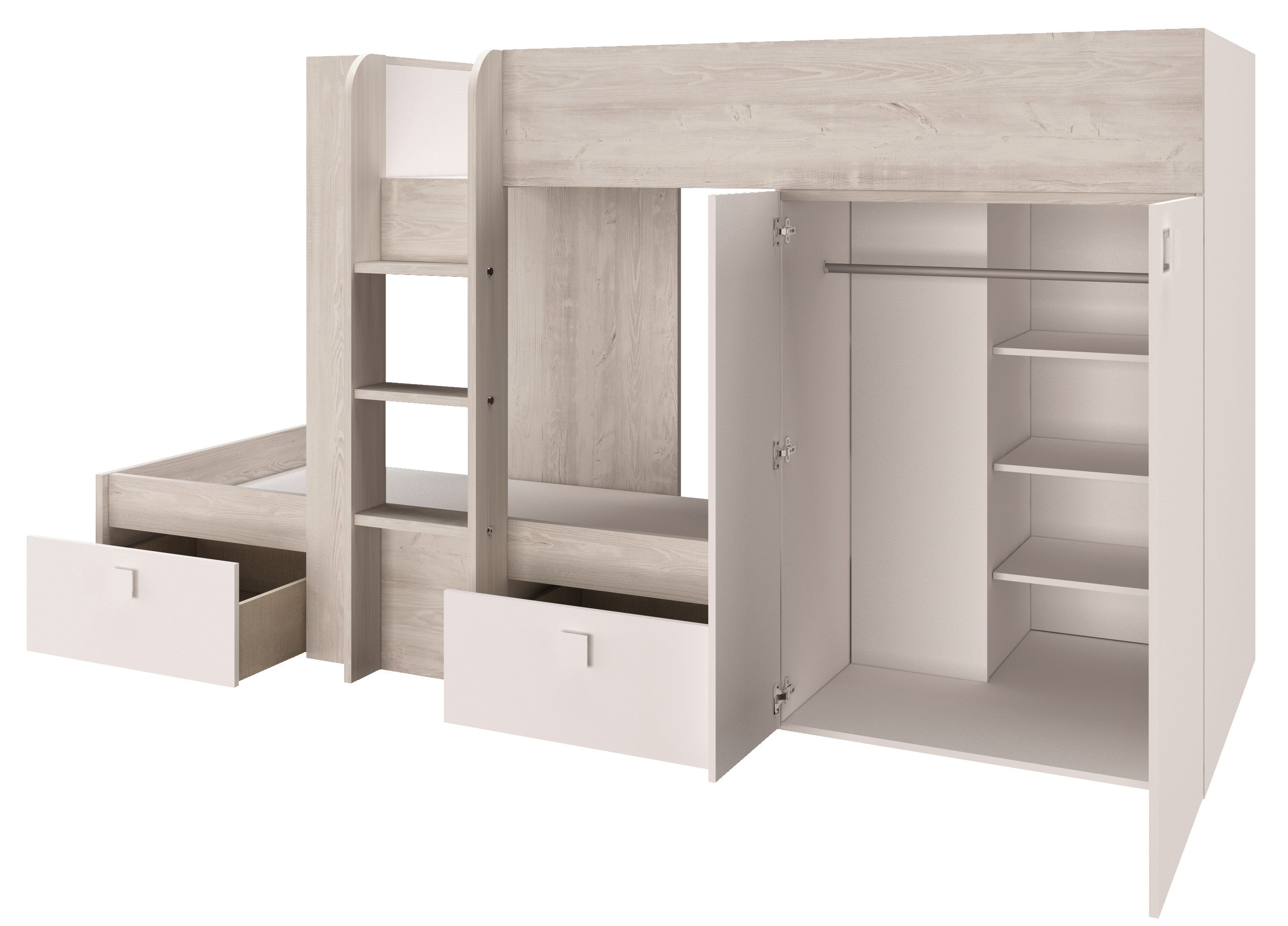Built in storage drawers, and wardrobe.